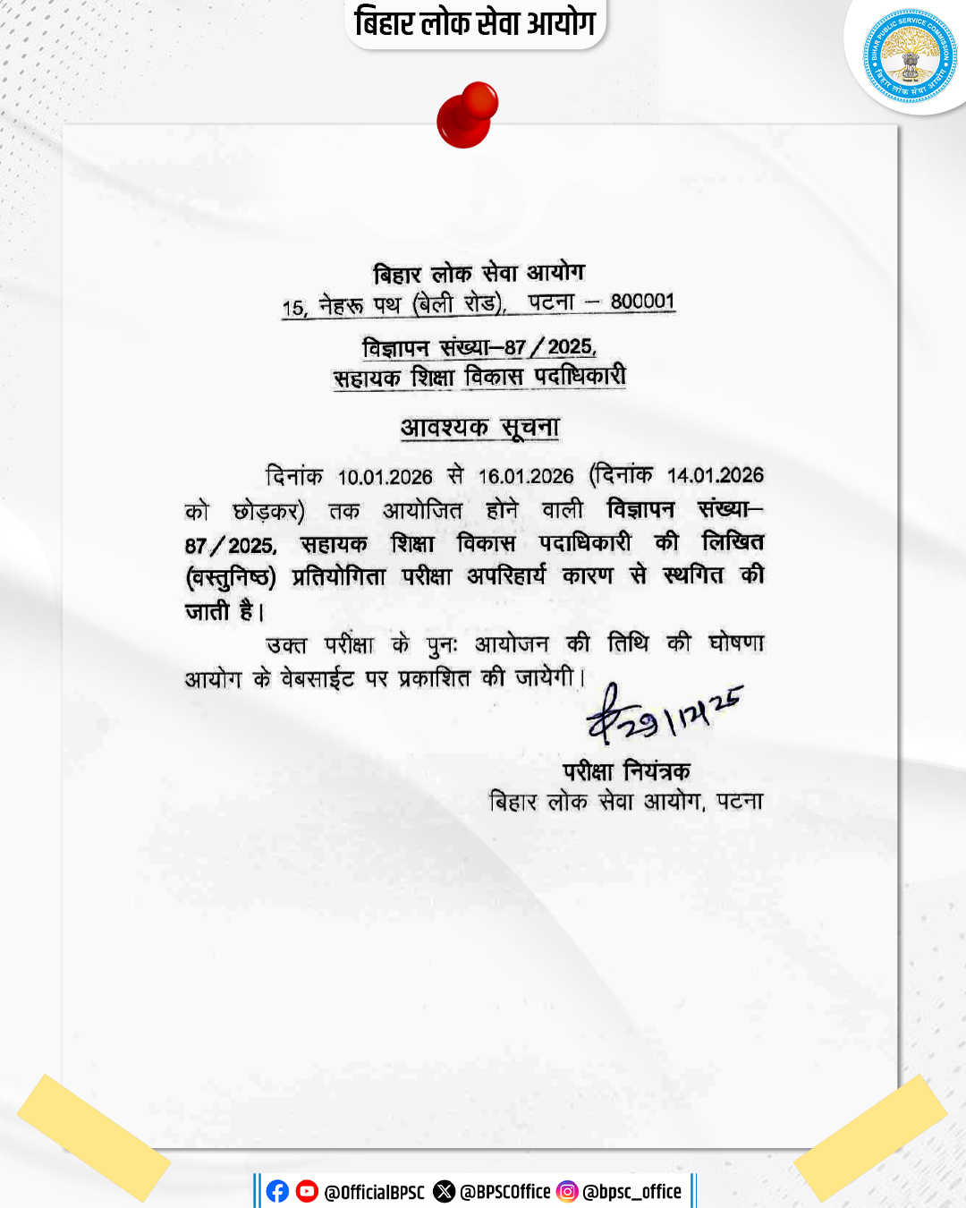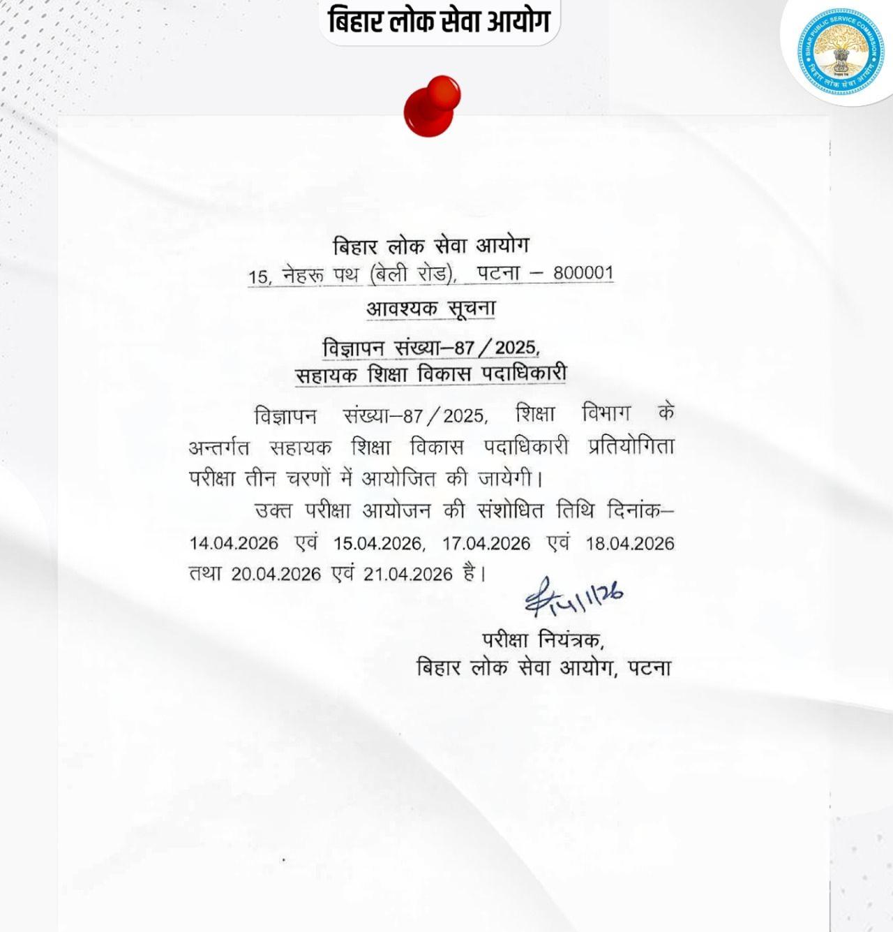 Bihar Public Service Commission (BPSC) has officially released the BPSC AEDO New Exam Date 2026 on its official website. The revised examination schedule has been announced for the recruitment of Assistant District Education Officer (AEDO) under Advertisement No. 87/2025.